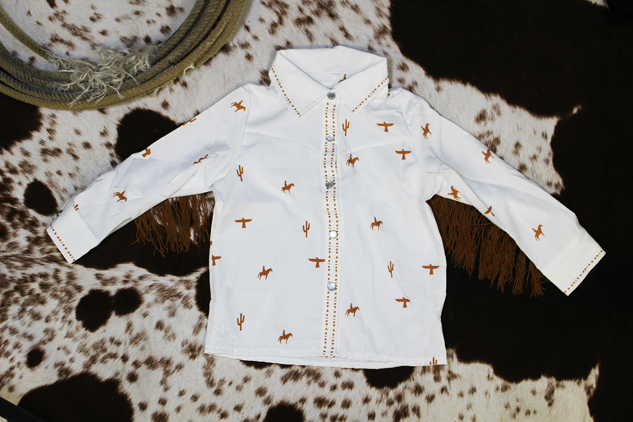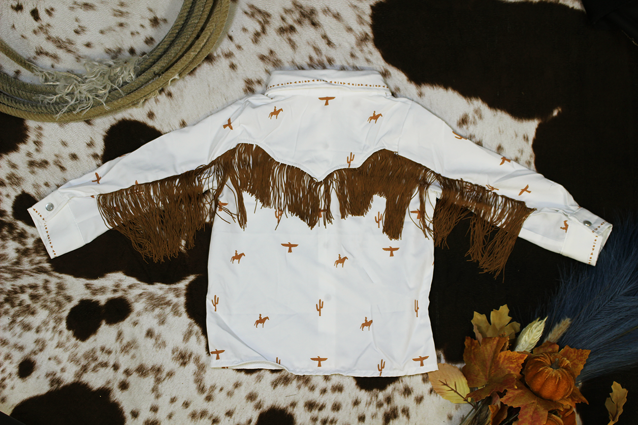 The definition of business in the front and party in the backđ The Desert Cowgirl Pearl Snap with fringe on the back is perfect for rodeos, 4H shows, school events, and holidaysđ¤ donât forget to grab your mini cowgirl one in the onsie style to match big sissy!Â